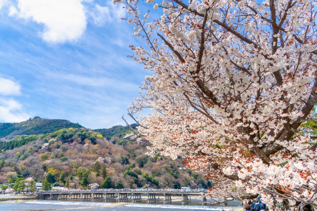 京都・嵐山は春になると山全体が桜色に染まる人気観光地。渡月橋と桜、川の流れ、山並みの景色はまさに絶景で、「京都 春 写真スポット」として外せません。竹林散策とあわせて楽しむのもおすすめです。